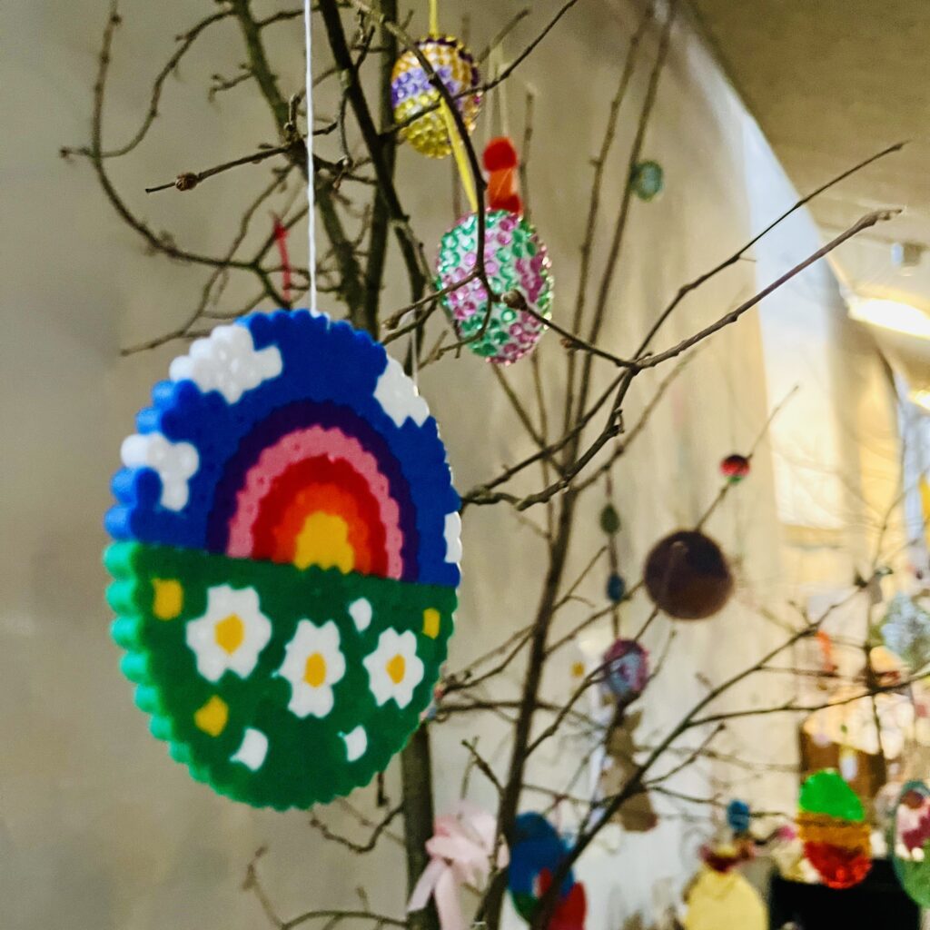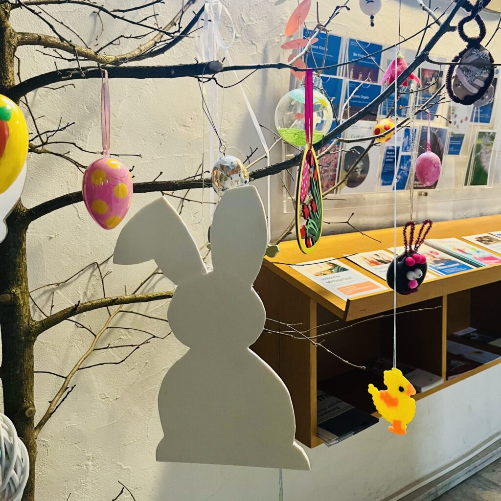 Passion und Ostern – die Geschichte hat viele traurige Stellen. Dennoch, sie hat ein schönes Ende und zeigt uns, welche tiefere Bedeutung Ostern in unserer Tradition hat. Auch in einer schwierigen, aussichtslos erscheinenden Lage ist ein Neuanfang möglich. Diese Hoffnung und die damit verbundene Lebensfreude wollen wir mit den farbenfrohen Osterbäumen auf dem Kirchenhügel zum Ausdruck bringen. Lassen Sie sich anstecken und gestalten Sie sich Ihren eigenen Osterbaum zu Hause. Alle Sujets, die im hinteren Teil der Kirche im Hanfsamen hängen, sind selbstgemachte Geschenke aus den Vorjahren und können kostenlos mitgenommen werden.